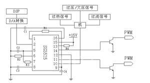 控制系統(tǒng)采用集成脈寬調(diào)制芯片SG3525構(gòu)成的脈寬調(diào)制電路。輸入SG3525的誤差信號經(jīng)過誤差放大器放大后,與其內(nèi)部振蕩器產(chǎn)生的鋸齒波進行比較,輸出的脈寬信號再經(jīng)分相器分成2路互不重疊的兩相信號,由具有圖騰柱結(jié)構(gòu)的輸出端11和14輸出??刂菩盘栐酱螅瑒t輸出的脈寬越寬,脈寬調(diào)制電路原理如圖4所示。由于驅(qū)動模塊M57959L需要的是低電平輸入信號,SG3525輸出的2路PWM 信號經(jīng)過工作在飽和狀態(tài)的三極管反相輸出后加到M57959L的13腳。