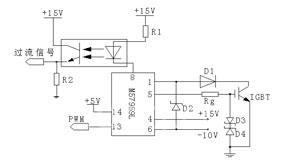 驅(qū)動電路的作用是將SG3525輸出的2路PWM 脈沖進行功率放大,以驅(qū)動IGBT。M57959L是日本三菱公司為驅(qū)動IGBT而設(shè)計的厚膜集成電路,具有封閉性短路保護功能,其實質(zhì)是一個隔離型放大器,采用光耦合方法實現(xiàn)輸入與輸出的電氣隔離,隔離電壓高達2500V;配置了短路/過載保護電路。M57959L驅(qū)動電路如圖5所示。電阻Rg為IGBT柵極限流電阻,二極管D1是過載/短路檢測二極管,穩(wěn)壓二極管D2用以補償D1反向恢復(fù)時間(在D1反向恢復(fù)時間偏長時使用),穩(wěn)壓二極管D3、D4用于保護IGBT的發(fā)射結(jié)。