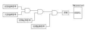 TMS320LF2407提供了PDPINTA輸入信號,可保證系統(tǒng)中功率轉(zhuǎn)換電路及逆變電路的安全可靠工作。保護電路結(jié)構(gòu)框圖如圖6所示。過壓/欠壓檢測信號、過流檢測信號、過熱檢測信號經(jīng)或門綜合后,經(jīng)過反相輸入到PDPINTA引腳。若有故障時,或門輸出為高電平,該引腳相應(yīng)為低電平, DSP的PWM輸出管腳全部成高阻狀態(tài),PWM輸出被封鎖。整個過程可由硬件實現(xiàn)。