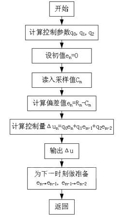 該系統(tǒng)軟件設(shè)計采用增量式PID控制算法,根據(jù)采樣時刻的偏差值計算控制量。采樣電路將電壓電流信號采集濾波后輸入到DSP,經(jīng)與輸入值相比較后進行數(shù)字PID運算,從而實現(xiàn)對輸出控制量的調(diào)節(jié)。增量式PID控制算法流程如圖8所示。