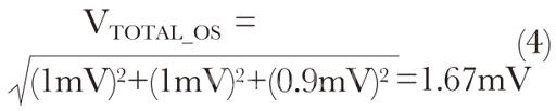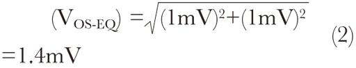 值得注意的是,A1的輸入偏移電壓無衰減地出現(xiàn)在其輸出端,同時出現(xiàn)在A2輸入端,然后被放大250倍。由于這些偏移電壓是不相關(guān)的,它們在A2輸入端可能整合為一個平方根和(RSS),并形成等效偏移電壓。假設(shè)兩個運放都有1mV的輸入偏移電壓,那么等效偏移電壓為: