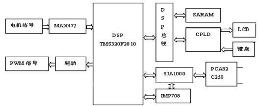 系統(tǒng)的控制節(jié)點硬件結(jié)構(gòu)如圖2所示,可以同時測試四個電機。硬件部分主要包括:電機的電流和輸出脈沖(OP)信號采集和信號調(diào)理電路、PWM輸出電路、復位上電電路、組合邏輯電路CPLD,CAN通信和鍵盤顯示接口等部分。其中DSP采用的是TI公司的高集成高性能DSP芯片TMS320F2810。CAN通信部分采用了PHILIPHIS公司的集成CAN控制芯片SJA1000(CAN總線控制器)和PCA82C250(CAN總線收發(fā)器),系統(tǒng)中設(shè)置CAN總線的最大傳輸量為500Kb/s,且晶振頻率定為16MHZ,CAN總線系統(tǒng)任意兩個節(jié)點之間的最大距離為130M,此時總線定時BTR0值為00H,BTR1值定為1CH。當IMP708復位上電時, F2810控制器通過通用I/O(GPIO)口給電機加電,同時通過F2810片內(nèi)的PWM模塊輸出占空比可調(diào)的矩形波信號控制電機的轉(zhuǎn)速。電機的電流信號和輸出脈沖信號經(jīng)過信號調(diào)理芯片MAX472進入到F2810的片內(nèi)A/D轉(zhuǎn)換器,轉(zhuǎn)換成數(shù)字信號供DSP處理。DSP計算出來的電流和轉(zhuǎn)速值顯示在液晶顯示器上,同時通過CAN總線傳送到上位PC機。各個節(jié)點通過鍵盤可以輸入測試參數(shù),包括PWM信號的占空比、轉(zhuǎn)速和電流的上下限參數(shù)等,也可以通過CAN總線由上位PC機設(shè)置。