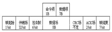 CAN遵從OSI層模型,按照OSI標準模型,CAN結(jié)構(gòu)劃分為兩層:數(shù)據(jù)鏈路層和物理層,它們由CAN控制器的硬件實現(xiàn)電平變換和幀的封裝。CAN網(wǎng)絡(luò)中包括4種不同類型的幀。其中,數(shù)據(jù)幀將數(shù)據(jù)由發(fā)送器傳至接收器;遠程幀由節(jié)點發(fā)送以請求具有相同ID標志符的數(shù)據(jù)幀;出錯幀可由任何節(jié)點發(fā)送,以控制總線錯誤;而超載幀用于提供先前和后續(xù)數(shù)據(jù)幀或遠程幀之間的附加延時。另外,數(shù)據(jù)幀和遠程幀以幀空間同先前幀隔開。在實際應(yīng)用中,還需要建立自己的上層協(xié)議。在本系統(tǒng)設(shè)計中,采用簡單實用的“命令項加數(shù)據(jù)項”結(jié)構(gòu)[3],其完整數(shù)據(jù)幀結(jié)構(gòu)如圖5所示??紤]到工在業(yè)控制中,功能一般不多,因此命令項的長度設(shè)定為1B(可描述128種命令)。而在本控制系統(tǒng)中,命令所需參數(shù)一般不會大于7B,故數(shù)據(jù)項長度直接設(shè)為7B。