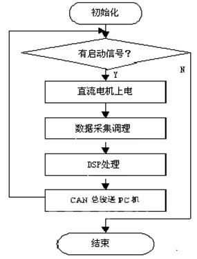 系統(tǒng)的CAN應(yīng)用節(jié)點部分采用的是BasicCAN程序,它包含初始化子程序、發(fā)送子程序、接收子程序三個部分。DSP軟件編寫采用的是TI公司的DSP集成開發(fā)環(huán)境CCS2000,它支持匯編語言和C語言編程。為了保證程序運行效率,核心算法FFT程序和中斷向量表程序采用匯編語言編寫,而其它程序都采用C語言編寫,使本系統(tǒng)軟件具有模塊化、結(jié)構(gòu)化、可移植性好和調(diào)試方便的特點。系統(tǒng)的軟件執(zhí)行過程是:首先是系統(tǒng)初始化工作,即設(shè)置寄存器、配置GPIO、定時器、A/D轉(zhuǎn)換器和外部中斷、啟動A/D轉(zhuǎn)換。然后檢測GPIO有沒有啟動信號,檢測到啟動信號后,從另一個GPIO發(fā)出控制信號給直流電機加電。從A/D轉(zhuǎn)換器里讀取電流信號數(shù)據(jù),再通過求平均值得到電機的電流值;對輸出脈沖信號的數(shù)據(jù)進行FFT變換,求出基波的頻率,再根據(jù)電機的具體型號乘以一個系數(shù)得到電機的轉(zhuǎn)速。最后把測試電流和轉(zhuǎn)速送給LCD顯示,啟動CAN總線傳輸,把測試結(jié)果傳輸?shù)缴衔籔C機,以對數(shù)據(jù)進行保存和分析。軟件流程如圖4所示。