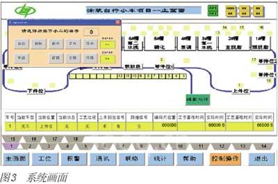 (2)主控柜安裝了一臺HMI,選用菲尼克斯電氣TP 12T觸摸屏,對18臺小車進(jìn)行啟動、停止、吊具的升降及各工序工藝時(shí)間的控制和操作;實(shí)時(shí)顯示整線運(yùn)行情況,在線顯示車組狀態(tài)、位置、所載工件類別和當(dāng)前工藝節(jié)拍狀態(tài)等信息,并能進(jìn)行故障診斷和報(bào)警(見圖3)。