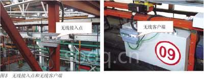 (2)設(shè)置無線接入點(diǎn)(AP)2臺。經(jīng)測試實(shí)際用1個(gè)無線接入點(diǎn)就可以滿足系統(tǒng)通信需求,最終采用了兩個(gè)無線接入點(diǎn)的方案,一方面是考慮到其中任一臺出現(xiàn)故障,另一個(gè)仍然可以確保網(wǎng)絡(luò)正常運(yùn)行,起到熱備的作用,提高了系統(tǒng)的可靠性;另一方面采用兩個(gè)無線接入點(diǎn)可以實(shí)現(xiàn)無線客戶端漫游通信,兩個(gè)無線接入點(diǎn)都正常時(shí),不管小車運(yùn)行到哪個(gè)位置無線客戶端都能保持與無線接入點(diǎn)的通信距離,保證獲得非常好的通信質(zhì)量?,F(xiàn)場無線接入點(diǎn)和無線客戶端以及設(shè)置如圖5、圖6所示。