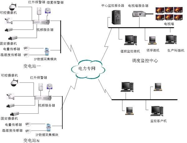 前端監(jiān)控現(xiàn)場(chǎng)根據(jù)變電站具體情況安裝相應(yīng)數(shù)量的攝像機(jī),以及相應(yīng)的報(bào)警器(比如紅外報(bào)警器、煙霧報(bào)警器等),把攝像機(jī)視頻線纜、控制線纜等都連接到網(wǎng)絡(luò)視頻服務(wù)器上,根據(jù)網(wǎng)絡(luò)視頻服務(wù)器的不同,每個(gè)視頻服務(wù)器可以連接1-16個(gè)攝像機(jī)。網(wǎng)絡(luò)視頻服務(wù)器有網(wǎng)絡(luò)接口,可以直接連接到交換機(jī)上,把圖像及相關(guān)數(shù)據(jù)傳送到網(wǎng)絡(luò)上。假如變電站有相關(guān)溫濕度、電壓電流等部分模擬量需要監(jiān)控,可以配置IP數(shù)據(jù)模塊(內(nèi)置RJ45網(wǎng)絡(luò)口,直接連接網(wǎng)絡(luò))和相應(yīng)的溫濕度傳感器和電量傳感器,可以把相關(guān)數(shù)據(jù)傳輸?shù)奖O(jiān)控中心。