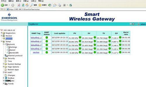 Emerson智能無線網(wǎng)關(guān)內(nèi)嵌軟件(版本3.8.9),對網(wǎng)關(guān)及無線系統(tǒng)的設(shè)置與瀏覽通過IE瀏覽器進(jìn)行,無需其他軟件,分別在Setup—>Internet protocol中設(shè)置IP地址為,在Setup—>HART中設(shè)置儀表參數(shù),在Setup—>OPC中設(shè)置要映射上傳到上位機(jī)的變量。整個過程較簡潔。