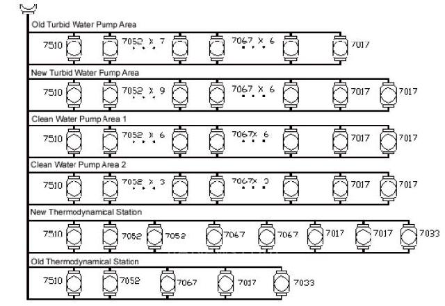 新渾水泵區(qū)共有6 臺(tái)渾水泵,它和5 臺(tái)老渾水泵完成同樣的功能,只是設(shè)備比較新,即使用水淡季,6 臺(tái)泵也是常開(kāi)的。兩個(gè)渾水泵區(qū)相距大概400 米。該區(qū)也用到了I-7052?pI-7067?pI-7017 和I-7510 共21 個(gè)模塊來(lái)完成泵和閥門(mén)的數(shù)據(jù)采集和控制。
