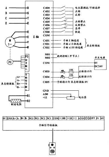 機(jī)床的X、Y、Z、W、V軸分別由五臺雙PG伺服控制器控制,由各自的電位器控制發(fā)出模擬電壓控制各軸的進(jìn)給速度。機(jī)床的手動脈沖發(fā)生器,通過軸選通信號分別接到五臺伺服控制器外部PG輸入口,控制各軸的進(jìn)給和定位。