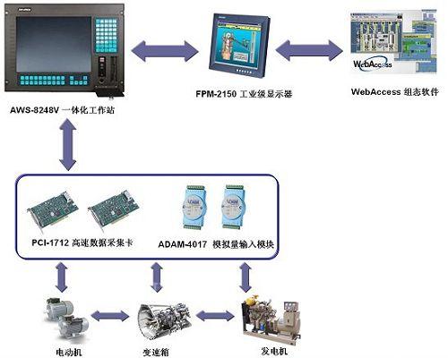 該系統(tǒng)采用研華一體化工作站AWS-8248,用于連接工業(yè)及顯示器FPM-2150和數(shù)據(jù)采集卡PCI-1712,在實(shí)現(xiàn)顯示的同時(shí)輸出顯示到中控室。PCI-1712用于輸出控制參數(shù),實(shí)現(xiàn)對(duì)變速箱的加載、換檔等操作,同時(shí)讀取變速箱運(yùn)行參數(shù):溫度、轉(zhuǎn)速、扭矩、噪音等,并借助于WebAccess組態(tài)軟件實(shí)現(xiàn)數(shù)據(jù)記錄與實(shí)時(shí)監(jiān)控,遇到故障后能夠自動(dòng)報(bào)警、自動(dòng)分析。