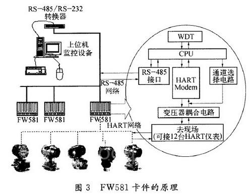FW581的原理框圖如圖3所示。硬件電路主要包括:中央處理器(CPU)、HART調(diào)制解調(diào)器(Modem)及耦合電路、與現(xiàn)場儀表的信號(hào)選擇及隔離電路、RS一485接口電路、WDT電路等幾個(gè)部分。