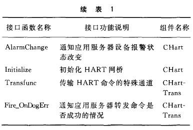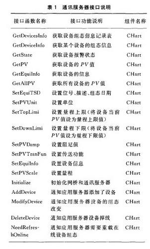 與HART協(xié)議通信裝置配套的HART通信服務(wù)器軟件,包括COM 服務(wù)器和OPC服務(wù)器。COM 服務(wù)器實(shí)現(xiàn)與HART 網(wǎng)橋的串行通訊,向HART網(wǎng)橋下發(fā)對儀表基本信息和過程變量的讀取命令,接收并處理HART網(wǎng)橋傳上來的儀表過程變量和報(bào)警信息;并且支持向下轉(zhuǎn)發(fā)特殊的HART協(xié)議命令,實(shí)現(xiàn)對現(xiàn)場HART儀表的組態(tài)和監(jiān)控。OPC服務(wù)器將現(xiàn)場HART儀表信號(hào)傳輸?shù)絆PC服務(wù)器工作站。HART Server通訊服務(wù)器接口說明見表 1所列。