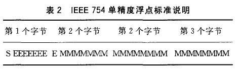 共有9個(gè)字節(jié),每個(gè)字節(jié)由2位十六進(jìn)制數(shù)組成,其中第1個(gè)字節(jié)為HART命令號(hào),目前為1號(hào)通用命令;第2個(gè)字節(jié)為從第3個(gè)字節(jié)開始的字節(jié)數(shù);第3個(gè)和第4個(gè)字節(jié)為本次響應(yīng)碼的校驗(yàn)碼;第5個(gè),第9個(gè)字節(jié)為當(dāng)前智能儀表的PV值,且滿足IEEE 754標(biāo)準(zhǔn)。IEEE 574單精度浮點(diǎn)標(biāo)準(zhǔn)規(guī)定如表2所列。