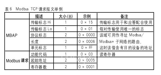 Modbus TCP請求報(bào)文舉例(見表6)。