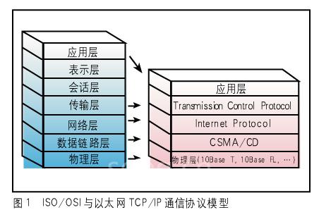 另外,使用TCP/IP也簡化了OSI模型,因?yàn)樗÷粤吮硎緦雍蜁?huì)話層。如果現(xiàn)在把以太網(wǎng)的物理層和數(shù)據(jù)鏈路層加到OSI模型就構(gòu)成了基于以太網(wǎng)的TCP/IP網(wǎng),如圖1所示。用以太網(wǎng)實(shí)現(xiàn)TCP/IP也是經(jīng)濟(jì)的一種方式。
