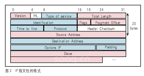 IP是面向報(bào)文的協(xié)議,它獨(dú)立處理每個(gè)報(bào)文包,每個(gè)報(bào)文包必須含有完整的尋址信息。IP報(bào)文包的格式如圖2所示。
