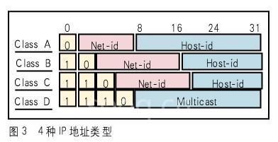 IP地址的類型共有4種(如圖3所示):A類用于處理超大型網(wǎng)絡(luò),最多16387064個(gè)主機(jī)(1~126);B類網(wǎng)絡(luò)最多可有64516個(gè)主機(jī)(網(wǎng)絡(luò)地址的第一段為128~191);C類用于小型網(wǎng)絡(luò),最多可有254個(gè)主機(jī)(網(wǎng)絡(luò)地址的第一段為192~223);D類用于多點(diǎn)播送,用于多目的信息的傳輸。全零(“”)地址對應(yīng)于當(dāng)前主機(jī),全1地址(“”)是當(dāng)前子網(wǎng)的廣播地址。