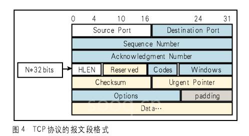 TCP是基于傳輸層的協(xié)議(如圖4所示),協(xié)議文件可從RFC793得到,使用廣泛,面向連接的可靠協(xié)議。它能把報(bào)文分解為數(shù)段,在目的站再重新裝配這些段,支持重新發(fā)送未被收到的段,提供兩臺設(shè)備間的全雙工連接,允許它們高效地交換大量數(shù)據(jù)。TCP使用滑動(dòng)窗口協(xié)議來高效使用網(wǎng)絡(luò)。由于TCP很少干預(yù)底層投遞系統(tǒng)的工作,它適應(yīng)各種投遞系統(tǒng);且提供流量控制,能使各種不同速率的系統(tǒng)進(jìn)行通信。報(bào)文段是TCP所使用的基本傳輸單元,用于傳輸數(shù)據(jù)或控制信息。