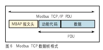 在TCP/IP以太網(wǎng)上傳輸,支持Ethernet II和802.3兩種幀格式。圖6所示,Modbus TCP數(shù)據(jù)幀包含報(bào)文頭、功能代碼和數(shù)據(jù)3部分。