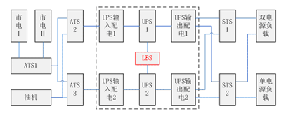 傳統(tǒng)雙總線系統(tǒng)兩路UPS之間需使用總線同步控制器(LBS)進(jìn)行同步控制,使得兩路UPS輸出電壓同頻、同相、同幅值,才能夠保障STS的安全轉(zhuǎn)換提供必要的條件,因?yàn)榭偩€同步控制器的工作狀態(tài)同時與雙總線的兩路UPS有關(guān),如果總線同步控制器LBS發(fā)生故障將會造成整個系統(tǒng)的不正常工作,所以在系統(tǒng)形成了單路徑故障點(diǎn)。傳統(tǒng)雙總線系統(tǒng)方框圖如下: