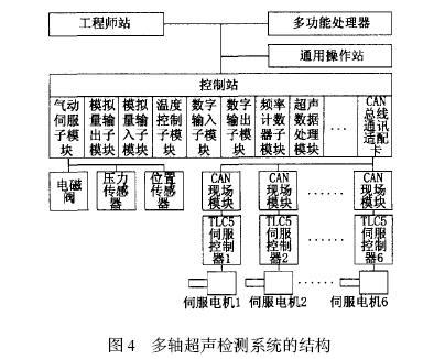 該超聲檢測系統(tǒng)的各個(gè)I/O組件及各主件內(nèi)部的各模塊之間的數(shù)據(jù)聯(lián)系采用了傳統(tǒng)的并行網(wǎng)絡(luò),系統(tǒng)控制網(wǎng)絡(luò)引入了CANbus,通過該總線可以實(shí)現(xiàn)對現(xiàn)場伺服控制器直接控制,同時(shí)還可實(shí)現(xiàn)該系統(tǒng)同其他超聲設(shè)備間的數(shù)據(jù)交換。如果采用多主模式還可以向上融入系統(tǒng)網(wǎng)絡(luò)。多軸超聲檢測系統(tǒng)的結(jié)構(gòu)示意圖如圖4。