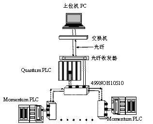 該系統(tǒng)控制網(wǎng)絡的硬件組成是:中控室操作站PC一臺,現(xiàn)場控制站Quantum PLC一臺、遠程控制子站Momentum PLC十臺,施耐德MODICON以太網(wǎng)集線器10Mbps 3TP/FL 499NOH10510十一只,工業(yè)以太網(wǎng)光纖網(wǎng)絡收發(fā)器一只。