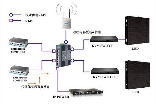 本系統(tǒng)采用研華EKI-2526PI PoE工業(yè)以太網(wǎng)交換機(jī),作為整個(gè)戶外LED大屏幕的通訊樞紐。EKI-2526PI分別連接LED顯示屏,多主機(jī)切換器(KVM Switch),IP電源(IP Power),無線AP和嵌入式工控機(jī)(Embedded Computer)。由于8m2戶外LED大屏幕可布線的空間有限,其中多主機(jī)切換器(KVM Switch)和無線AP通過PoE端口供電,布局更加合理。