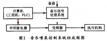 本文所介紹的城市水景工程中的音樂(lè)噴泉控制系統(tǒng)主要由計(jì)算機(jī)(工控機(jī)、PLC等)、音樂(lè)信號(hào)處理系統(tǒng)、中間繼電器、變頻器、執(zhí)行機(jī)構(gòu)組成。圖1所示是城市音樂(lè)噴泉控制系統(tǒng)的組成結(jié)構(gòu)框圖。