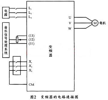 設(shè)計(jì)時(shí),可將變頻器的電源輸入端L1、L2、L3直接接到控制柜中空氣開關(guān)的輸出端,而將變頻器的U、V、W輸出到水泵或擺動(dòng)電機(jī),同時(shí)將變頻器的信號(hào)輸入端11、12、13分別接到音樂(lè)信號(hào)處理系統(tǒng)的輸出端。并將變頻器的X1、X2、X3接到中間繼電器的常開觸點(diǎn),這樣,通過(guò)繼電器就可在PLC、單片機(jī)或工控機(jī)的控制下,對(duì)音樂(lè)噴泉的水柱水型進(jìn)行控制。具體連接如圖2。