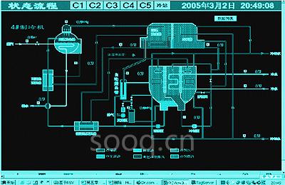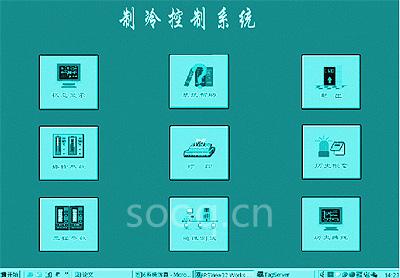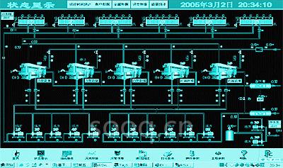?。?) 人機(jī)界面。在人機(jī)界面上顯示冷站工藝流程圖,也即模擬顯示現(xiàn)場(chǎng)系統(tǒng)及其環(huán)境;顯示現(xiàn)場(chǎng)設(shè)備操作方式、控制開(kāi)關(guān)及運(yùn)行狀態(tài)等;顯示系統(tǒng)運(yùn)行環(huán)境和工作的說(shuō)明信息;顯示類似于其它windows應(yīng)用軟件界面彈出式菜單,以便供操作人員調(diào)用非主界面信息,如各種現(xiàn)場(chǎng)設(shè)備的歷史運(yùn)行曲線圖、生產(chǎn)報(bào)表、二級(jí)顯示監(jiān)控界面和報(bào)警記錄等。