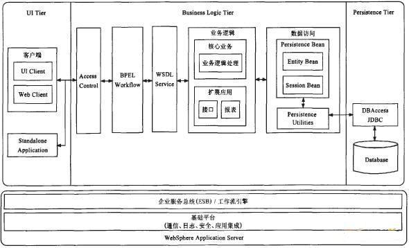 ?。?)系統(tǒng)模型:各模塊都是基于服務(wù)實(shí)現(xiàn)的,這些服務(wù)提供可被調(diào)用的Web Services接口。通過單個(gè)服務(wù)或者多個(gè)服務(wù)的組合來形成業(yè)務(wù)流程,從而構(gòu)成各業(yè)務(wù)子模塊。各子模塊通過SOAP消息進(jìn)行通信,相互訪問業(yè)務(wù)資源。系統(tǒng)從邏輯上分為3層:持久層、業(yè)務(wù)邏輯層、表示層。其中,持久層實(shí)現(xiàn)了業(yè)務(wù)對(duì)象數(shù)據(jù)的固化過程,主要封裝了通過JDBC訪問數(shù)據(jù)庫的一些方法,業(yè)務(wù)對(duì)象數(shù)據(jù)最終存儲(chǔ)的地方,例如Oracle、DB2、SQLServer數(shù)據(jù)庫等;業(yè)務(wù)邏輯層實(shí)現(xiàn)業(yè)務(wù)邏輯、服務(wù)封裝和數(shù)據(jù)訪問代理的功能,并采用一致的組織策略對(duì)所有業(yè)務(wù)實(shí)體進(jìn)行統(tǒng)一表示,對(duì)封裝的Web服務(wù)提供查找和邏輯組合功能,業(yè)務(wù)實(shí)體和數(shù)據(jù)類的映射采用XML配置文件實(shí)現(xiàn),業(yè)務(wù)邏輯層也是應(yīng)用服務(wù)器上的UI層代理,作為UI和中間業(yè)務(wù)邏輯層以及業(yè)務(wù)流程引擎打交道的橋梁,可以根據(jù)界面的要求組織業(yè)務(wù)邏輯層的調(diào)用;表示層是最終用戶的使用界面,包括Java應(yīng)用程序、JavaApplet、Scrvlet或者JSP程序統(tǒng)稱為UI層,主要體現(xiàn)與用戶的交互過程。系統(tǒng)模型如圖1所示。