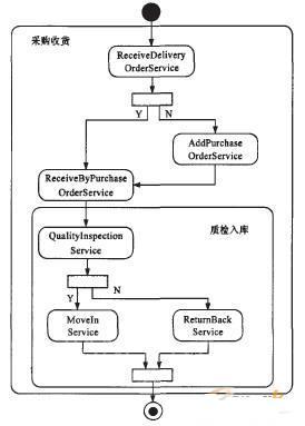 ?。?)服務(wù)組合及流程編排:采用BPEL流程管理器將上述定義好的Web服務(wù)進(jìn)行編排,定義這些Web服務(wù)操作的執(zhí)行順序,并將聚集Web服務(wù)定義的操作映射到內(nèi)含的Web服務(wù)所實(shí)現(xiàn)的操作中去。流程模型通過定義一個(gè)公共接口或操作的portType表示聚集Web服務(wù)。如圖3所示,在采購收貨流程中,將定義的Web服務(wù):接收交換單服務(wù)(ReceiveDeliveryOrderService)、按采購訂單收貨服務(wù)(ReceiveByPurchaseOrderService)、補(bǔ)采購訂單服務(wù)(AddeurchaseOrderService)、質(zhì)量檢驗(yàn)服務(wù)(QualitylnspectionService)、入庫服務(wù)(MoveInService)、退貨服務(wù)(RetumBackService),通過BPEL業(yè)務(wù)流程執(zhí)行語言進(jìn)行編排,實(shí)現(xiàn)這些服務(wù)的連接。