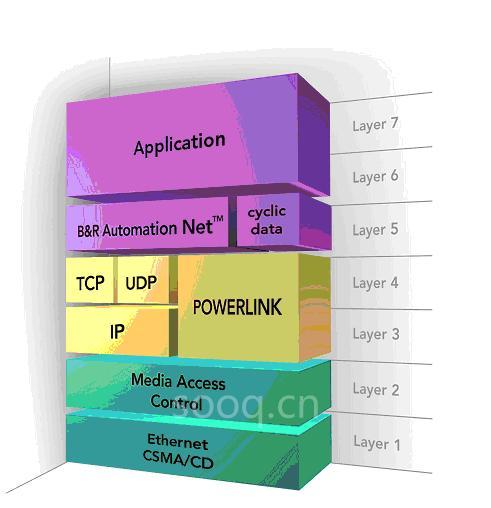 OSI模型表示了ETHERNET POWERLINK協(xié)議與上下各層次之間的關系。它表明使用CSMA/CD訪問方法和媒體訪問控制(MAC)的ETHERNET層處于基礎的位置。上方各層(IP與TCP或UDP)則由POWERLINK協(xié)議取而代之。B&R Automation NetTM也使用TCP/IP或UDP/IP,不過仍能夠與ETHERNET POWERLINK協(xié)同工作。因此,與應用層也就實現(xiàn)了高速循環(huán)數(shù)據(jù)通信。