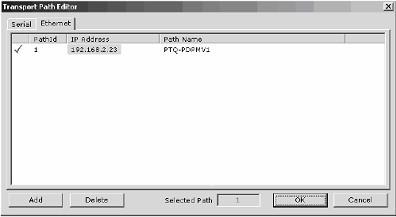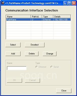 a) PTQ 用戶:點擊以太網(wǎng)選項卡,然后點擊“增加”按鈕。雙擊IP 地址區(qū),鍵入你為 ProSoft 技術公司 PROFIBUS 主站模塊設置的 IP 地址。加入一個描述性的“路徑名稱”。