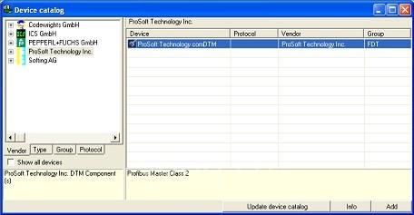 2. 升級或者更新設備目錄。如果 PROFIBUS comDTM 安裝成功,供應商選項卡里會出現(xiàn) ProSoft 技術公司的字樣。