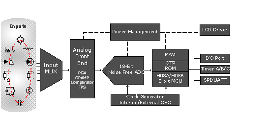 此系列在不同的封裝中提供了前所未見的豐富功能。成熟的集成技術(shù),成功地為客戶縮小由離散組件和運算放大器組成的分立替代方案,不僅幫助減少PCB尺寸并且有效降低額外物料管理成本。另外,高集成度的系列產(chǎn)品,具有高精度低功耗及產(chǎn)品開發(fā)便利的特性以符合追求高性價比的時代。其內(nèi)帶2.0MHz低頻率飄移震蕩器,適合不同環(huán)境溫度與工作電壓變化的應(yīng)用。28KHz低功號型式的震蕩器,讓芯片的電源節(jié)能管理更具彈性。除此之外,高分辨率18位250KHz取樣頻率的增量累加ΣΔADC,最高可編程的采樣速率達(dá)976.5 每秒數(shù)據(jù)轉(zhuǎn)換(SPS)及低溫飄系數(shù)增益誤差(Gain drift)5ppm/℃與低偏置電壓誤差(Offset Drift)0.02uV/℃。