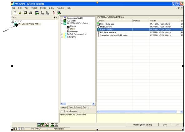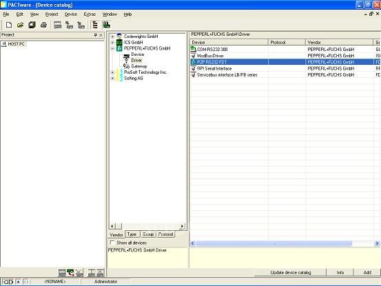 選擇一個你要進行設備連接的廠商名稱,如 PEPPERL+FUCHS GmbH。中間瀏覽器會出現(xiàn)三個子項名稱:設備、驅(qū)動器和網(wǎng)關(guān)。我們用鼠標點擊驅(qū)動器,右側(cè)窗口會出現(xiàn)五個已經(jīng)安裝的驅(qū)動器:COM-RS232-300、Modbus-Driver、P2P-RS232-FDT、RPI Serial Interface和ServiceBus Interface LB/FB series。