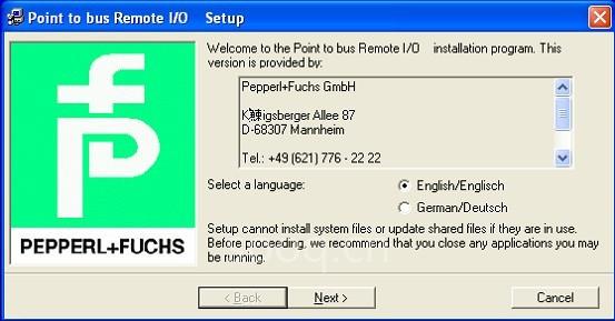 然后會(huì)出現(xiàn)Pepperl+Fuchs GmbH公司的地址、電話等信息,見(jiàn)圖10,選擇英語(yǔ)做為安裝的語(yǔ)言,按下一步(Next)繼續(xù)。