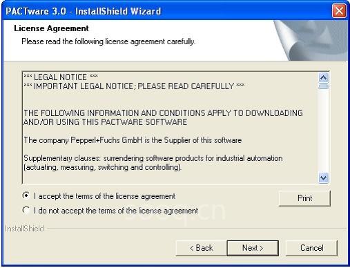 完成上述的過(guò)程后,再到P+F的網(wǎng)站:下載PACTware3.0。你可以在該網(wǎng)頁(yè)左面的產(chǎn)品瀏覽器中選擇:軟件->PACTware->下載壓縮的ZIP文件,然后解壓該文件夾到你的計(jì)算機(jī)硬盤(pán)中,然后點(diǎn)擊,開(kāi)始安裝。