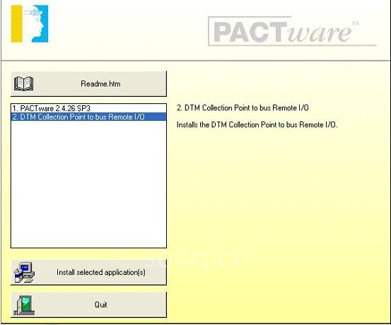 開(kāi)始的畫(huà)面見(jiàn)圖8,選擇2. DTM-Collection Point to bus Remote I/O,意為從選擇點(diǎn)到總線遠(yuǎn)程輸入/輸出,按安裝選擇應(yīng)用(Install Selected application)按鈕開(kāi)始安裝。