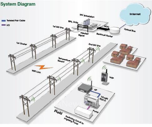 利用現(xiàn)有的電網(wǎng),通過(guò)Wi-Fi無(wú)線網(wǎng)絡(luò)技術(shù)為最終用戶提供了寬帶訪問(wèn)服務(wù)。有了Wi-Fi技術(shù),現(xiàn)在不再需要低壓電力線接入。通信數(shù)據(jù)包沿著電力線與電流一道傳輸,其傳輸頻率為1~34MHz,而電流傳輸頻率為50或60Hz。用戶可以使用Wi-Fi無(wú)線連接BPL通信網(wǎng)格。BPL網(wǎng)絡(luò)已經(jīng)安裝在總長(zhǎng)度70km的兩條中壓輸電線上,包括110個(gè)BPL監(jiān)視單元。此外,Moxa的ioLogik E2210模塊安裝在每個(gè)BPL單元中。系統(tǒng)結(jié)構(gòu)圖顯示了ioLogik是如何監(jiān)控Wi-Fi通信狀態(tài)的。當(dāng)通信丟失,ioLogik將自動(dòng)重啟Wi-Fi無(wú)線節(jié)點(diǎn),同時(shí)ioLogik發(fā)出 一個(gè)脈沖輸出信號(hào),觸發(fā)電力鐵塔的信號(hào)指示燈。這樣,工程師通過(guò)SNMP可以從中央控制室監(jiān)視所有的I/O信號(hào),用戶還可以利用SNMP協(xié)議遠(yuǎn)程控制灌溉泵。