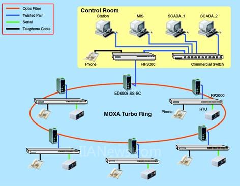 由EDS-408A工業(yè)以太網(wǎng)交換機和RP3000/200組成的這個光傳輸網(wǎng)絡(luò),完全滿足了客戶現(xiàn)場RTU數(shù)據(jù)和語音數(shù)據(jù)的傳輸。MOXA工業(yè)以太網(wǎng)交換機在電力行業(yè)中有著更廣泛的應(yīng)用。