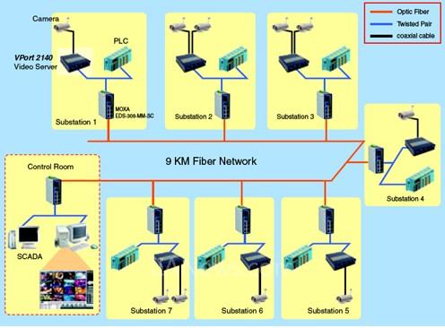 基于安全性考慮,KHLB使用1到2個攝像頭來監(jiān)控變電所內(nèi)的電力設(shè)備及主要入口。一般而言,為了傳送視頻影像到中央控制機房內(nèi),九公里長的同軸電纜布線是非常麻煩且昂貴的,而且會使DVR解決方案難以管理。MOXA視頻聯(lián)網(wǎng)解決方案,內(nèi)含VPort 2100系列視頻服務(wù)器及SoftDVR? Pro數(shù)字影像監(jiān)控軟件,是KHLB建置遠程監(jiān)控系統(tǒng)的最佳解決方案。