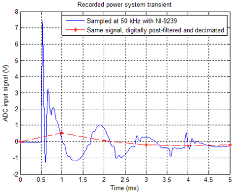 圖1 圖中的表格記錄了接地故障期間的瞬變,其中實線是 NI 9239模擬輸入模塊以50kHz的采樣率采集到的原始信號,虛線則是同樣的信號經過一個截止頻率為300Hz的二階的巴特沃茲低通濾波器之后以1000Hz的采樣率采集后的結果