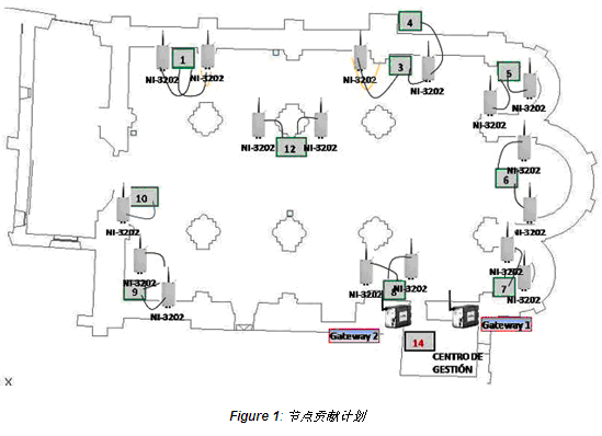 團隊最大的挑戰(zhàn)來自于線路的安裝與傳感器的隱藏,要在不妨礙遺跡外觀的同時保持良好的無線電信號,由于遺跡石墻和柱子的存在,這是很困難的。圖1描述了教堂中殿的傳感器網(wǎng)絡(luò)的大概位置。