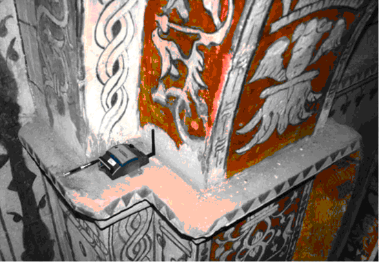 團隊在與中殿相連的小房間內(nèi)安裝了兩個,基于美觀的考慮,將他們從人群的視野當(dāng)中巧妙的隱藏了。然而,隱蔽的節(jié)點與中央計算機之間無線信號質(zhì)量就變差了。為解決這一問題,團隊放置了高增益的外部天線(9 dB)并為兩個網(wǎng)關(guān)使用了1.5米的延長線,將天線的放置靠近木門的內(nèi)框上,如圖2所示。