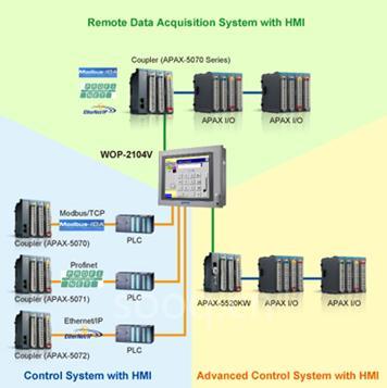 在一般的控制系統(tǒng)中,人機界面可以和PLC控制器相連接,來完成機電自動控制任務(wù),如工廠裝配生產(chǎn)線上的機械控制或過程控制。研華推出了耦合模塊APAX-5070/5071/5072來擴展現(xiàn)有PLC系統(tǒng)中的I/O,它可以通過不同的協(xié)議連接APAX I/O與PLC,例如Modbus/TCP, Profinet and EtherNet/IP。PLC用戶可以通過原始的PLC開發(fā)軟件輕易地使用APAX I/O,現(xiàn)有的PLC系統(tǒng)可以輕易地通過APAX-5000遠程輸入輸出系統(tǒng)增強靈活性和可擴展性。