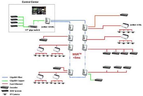 JetNet 5010G配備3個(gè)千兆combo可選端口, 可以通過(guò)加載光纖收發(fā)器模塊,延長(zhǎng)數(shù)據(jù)傳輸距離。此千兆工業(yè)交換機(jī)還支持MSR網(wǎng)絡(luò)冗余技術(shù),其中2個(gè)千兆端口用于建立冗余光纖網(wǎng)以確保高可靠度,高品質(zhì),大流量視頻數(shù)據(jù)傳輸,而第三個(gè)千兆端口作為上聯(lián)端口,連接監(jiān)控中心核心交換機(jī)。此外,LLDP鏈路層發(fā)現(xiàn)協(xié)議和JetView Pro Korenix網(wǎng)絡(luò)管理軟件能夠幫助用戶在幾秒鐘之內(nèi)自動(dòng)檢索網(wǎng)絡(luò)中的有效設(shè)備,便于在中控室有效的遠(yuǎn)程管理現(xiàn)場(chǎng)設(shè)備。