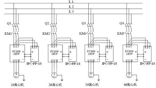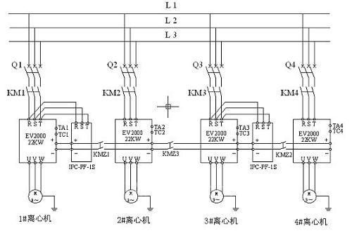 改造的離心機(jī)共12臺(tái)、每臺(tái)控制系統(tǒng)都是一樣。變頻器為艾默生EV2000系列22kW,恒轉(zhuǎn)矩型,回饋單元皆為加能的IPC-PF-1S回饋制動(dòng)單元,所有控制系統(tǒng)集中在一個(gè)配電室中。兩臺(tái)離心機(jī)共用一個(gè)GGD控制柜,限于篇幅只畫(huà)出其中四臺(tái),其余八臺(tái)與此類似。系統(tǒng)圖如圖1所示。